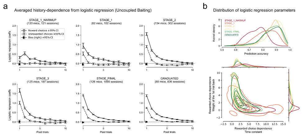 Fig. 3. Reward-history-dependent learning within and across sessions. (a) Regression coefficients develop over training stages and display exponential weighting as a function of trial history. (b) Reward-history-dependent learning evolves smoothly across learning stages.