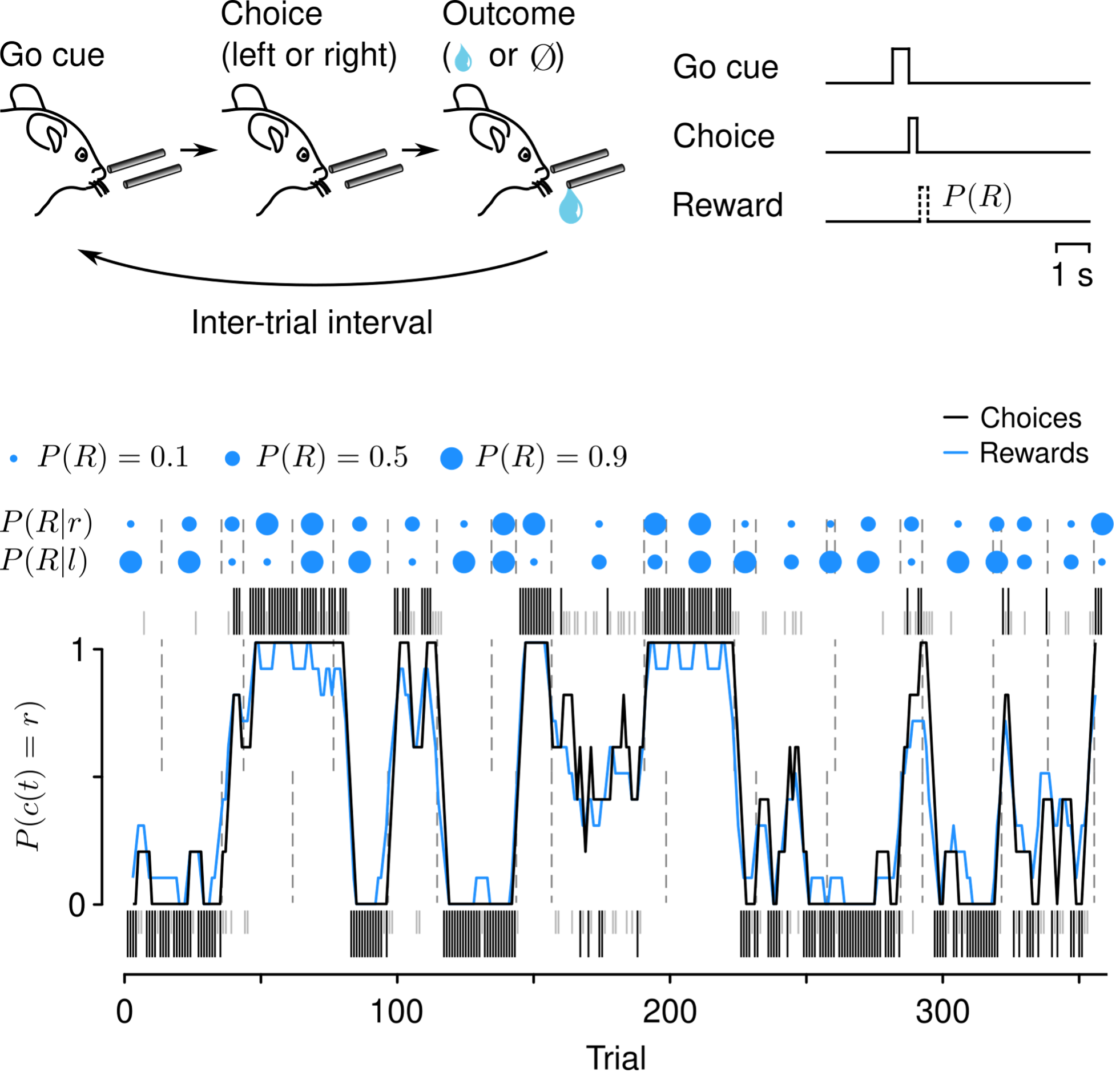 Fig. 1. Top, cartoon of behavioral task events. Bottom, behavioral data from an example session. Dots above the plot correspond to reward probabilities given leftward (P(R|l)) or rightward (P(R|r)) choices. Ticks correspond to choices to the left (below) or right (above) that were rewarded (black) or unrewarded (gray). The black curve is a running average of the mouse’s choices leftward or rightward. The blue curve is a running average of the reward available from the left or right. Note that the mouse’s choices closely follow the reward dynamics.